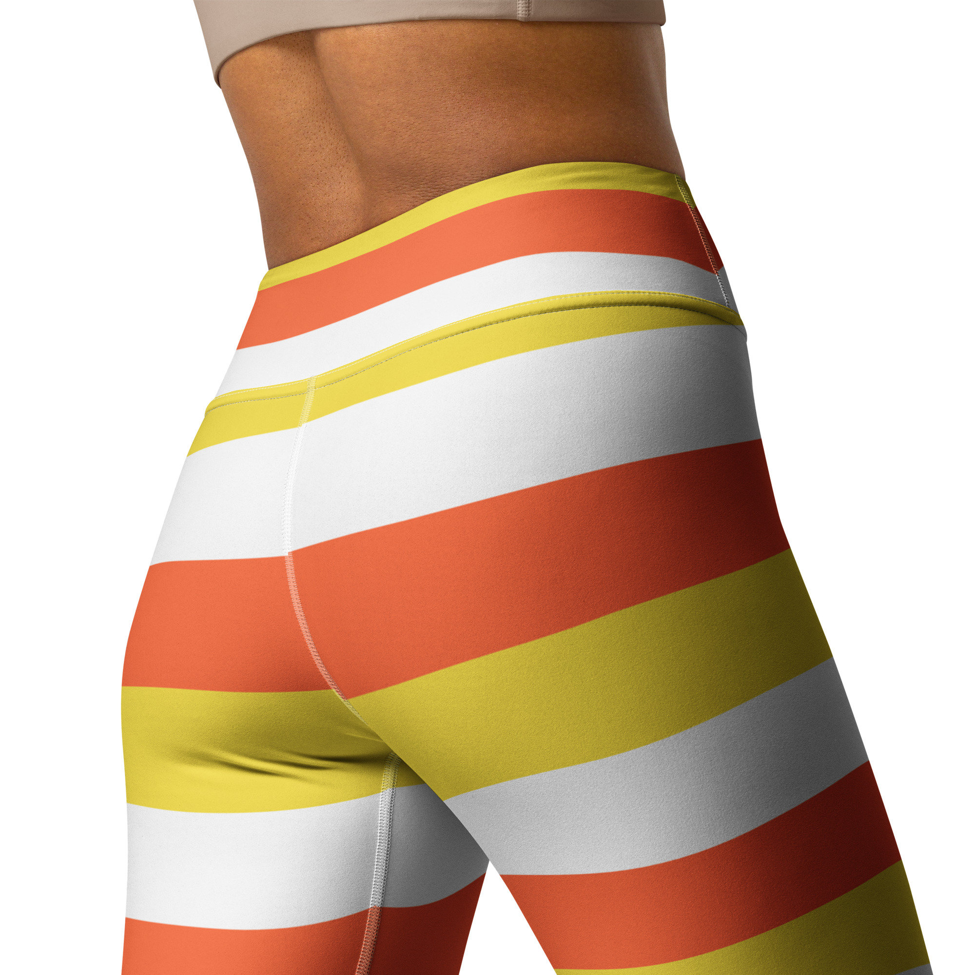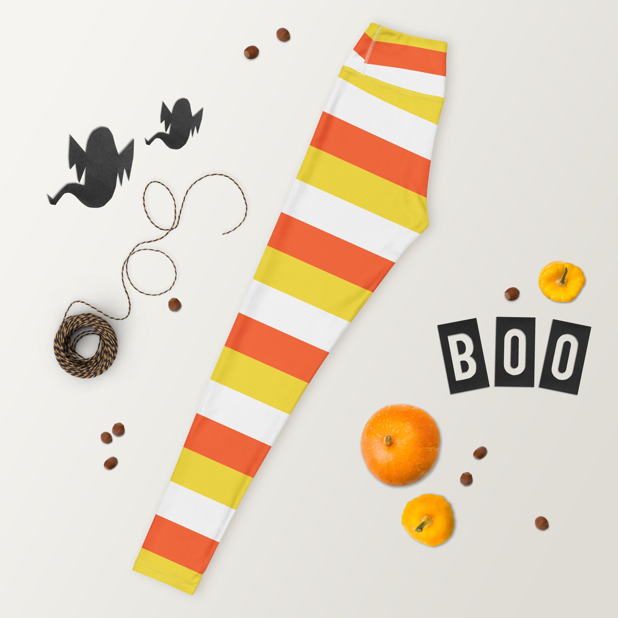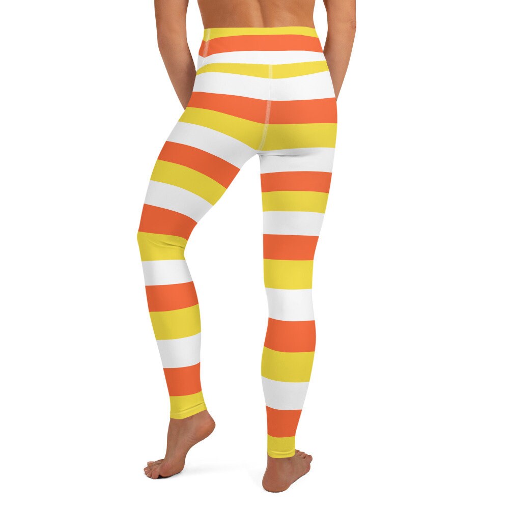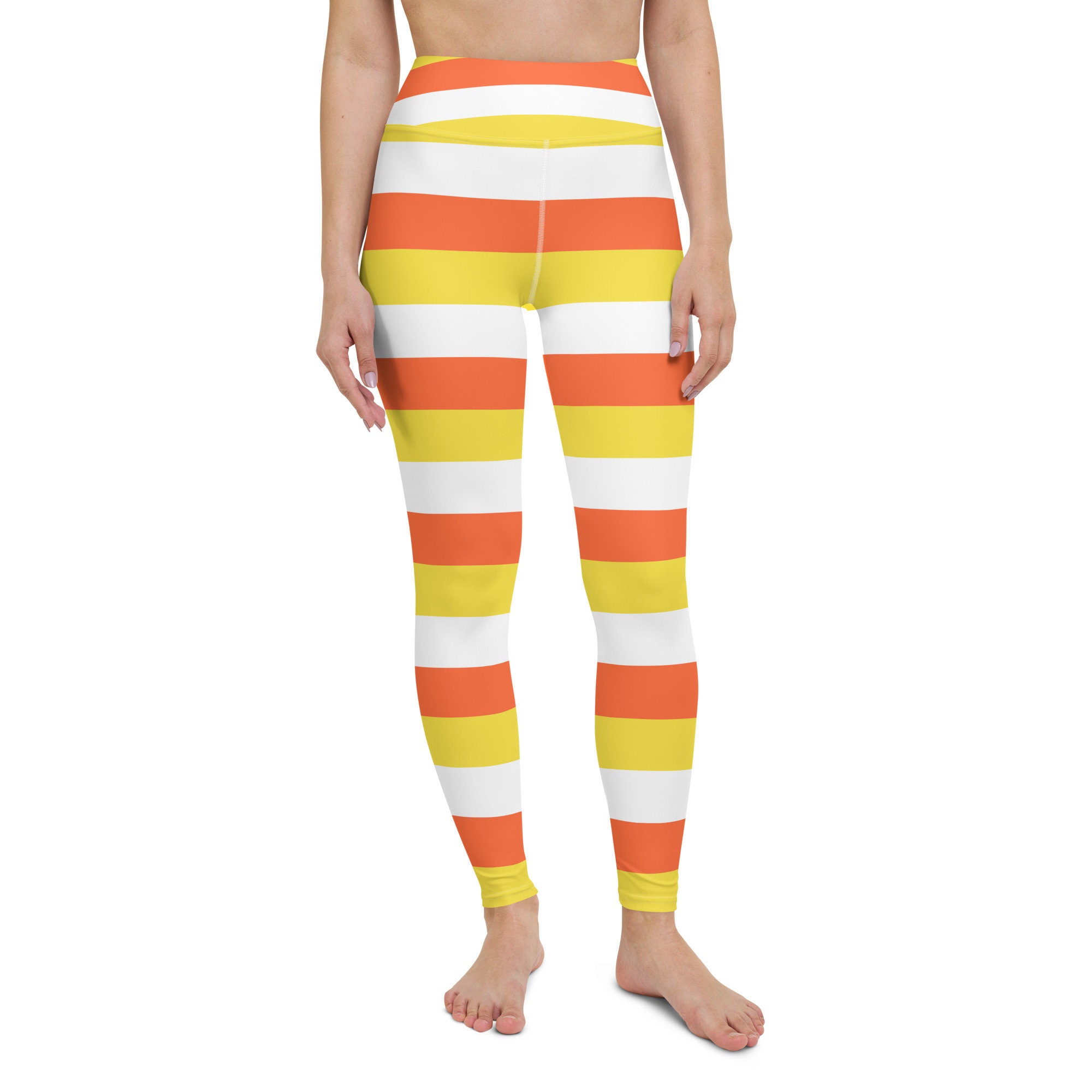 Sweeten your style with these Candy Corn Leggings, inspired by the iconic fall treat. Featuring bold horizontal stripes in orange, yellow, and white, these leggings are perfect for Halloween workouts, cozy autumn lounging, or festive fall fashion.