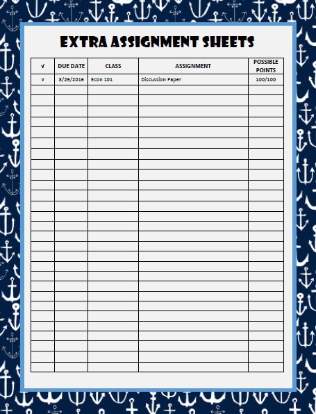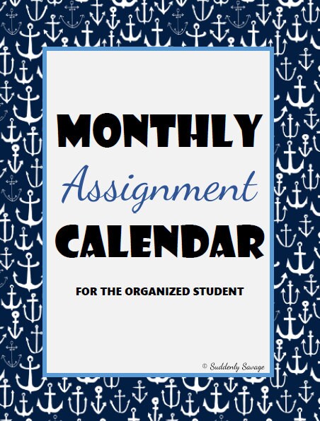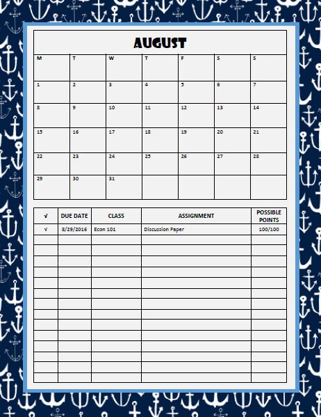 Anchors Away with this assignment calendar! Are you a student that loves to be organized? Do you have a student you want to help become more organized? Well, this monthly calendar is just what you need. It is simple and easy to use. Type into this document using the fill option available in some versions of Adobe PDF. Not able to type into the document? No problem, just print and write using colorful pens or pencils.